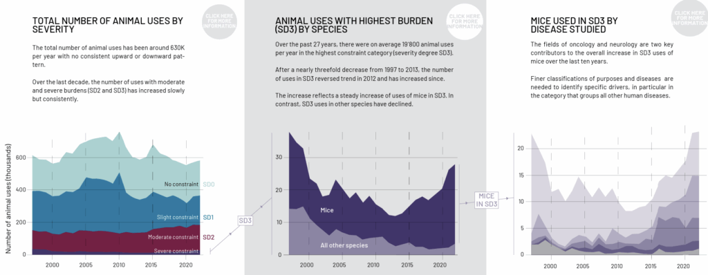To improve animal welfare in Switzerland, we need to understand not only how many animals and which species are used but also how they are used. By analysing 27 years of publicly available data, this report examines trends in the number of animal uses and their severity classification.